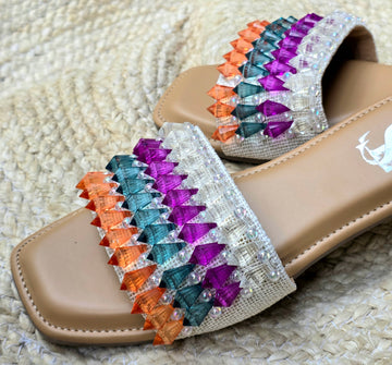 Step into elegance with these handcrafted flats adorned with lustrous pearls, dangling clear pearls, and...