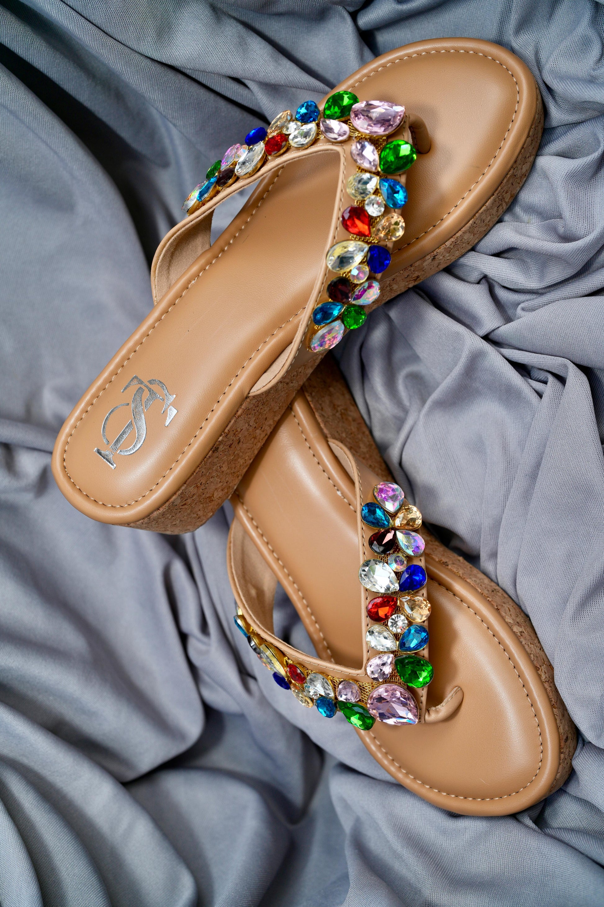 Add a vibrant edge to your look with the these Wedges, featuring a bold mix of multicolored gemstones across the upper strap. Set on a 2.5-inch wedge heel, these wedges strike the perfect balance between playful and polished — ideal for festive days, brunches, or statement evenings.