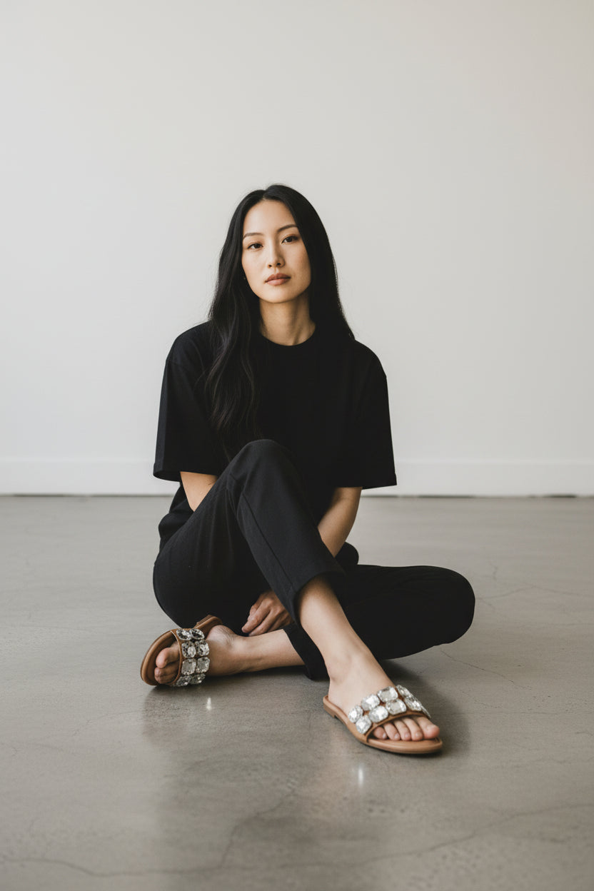 Featuring bold, multicoloured diamond stones set against a soft neutral base, these flats are perfect for brunches, getaways, and everything in between. Add a pop of glam to your step — effortlessly.