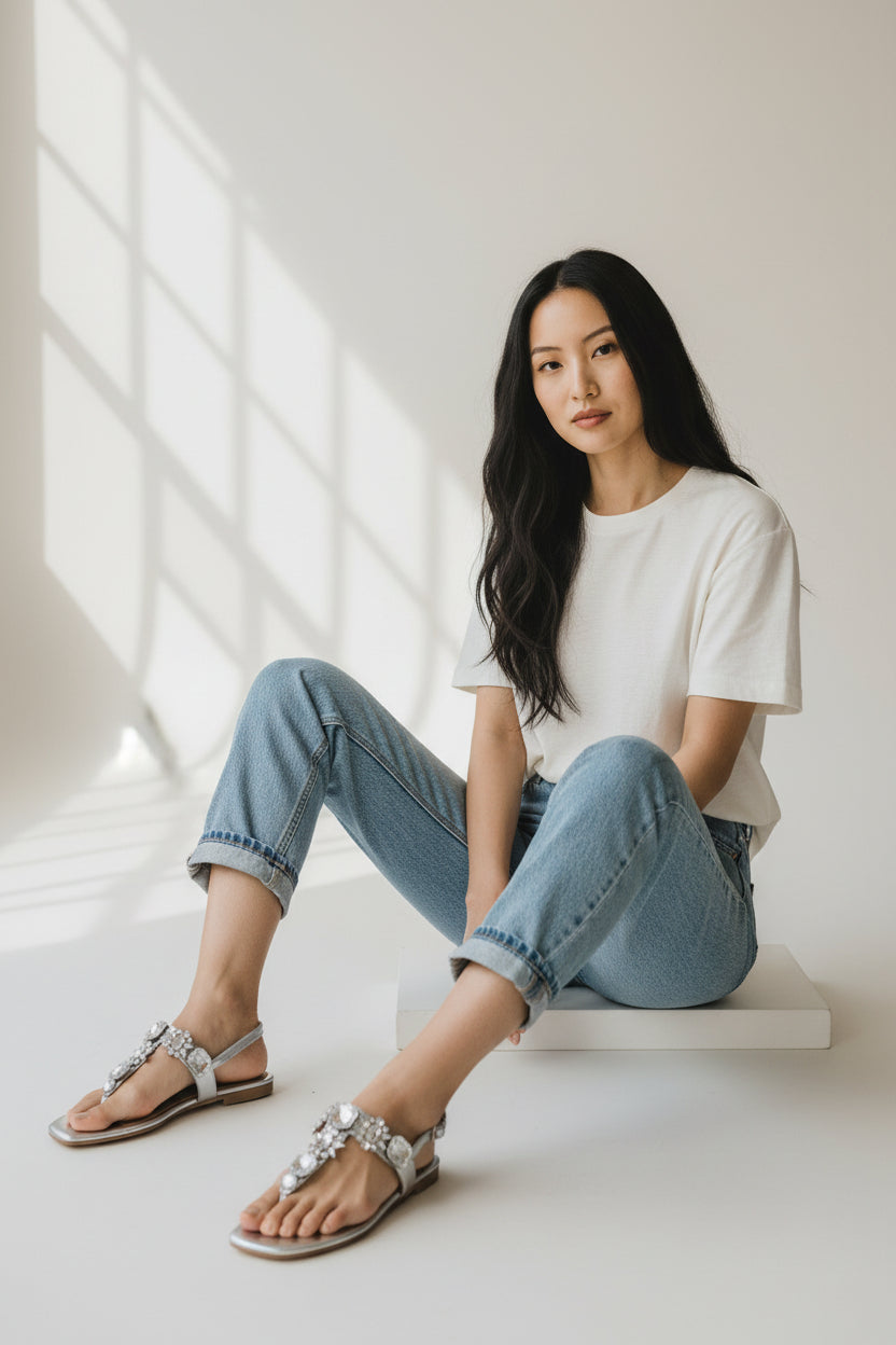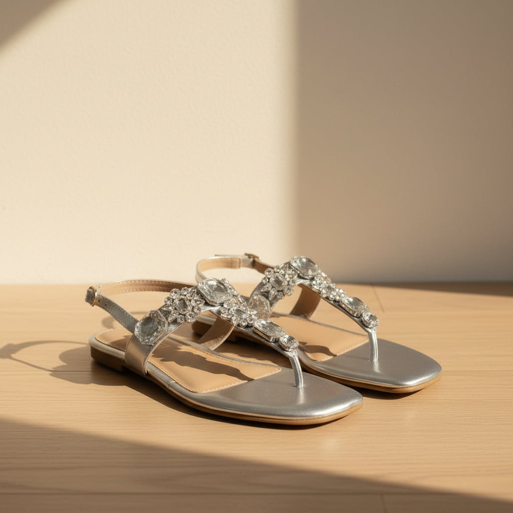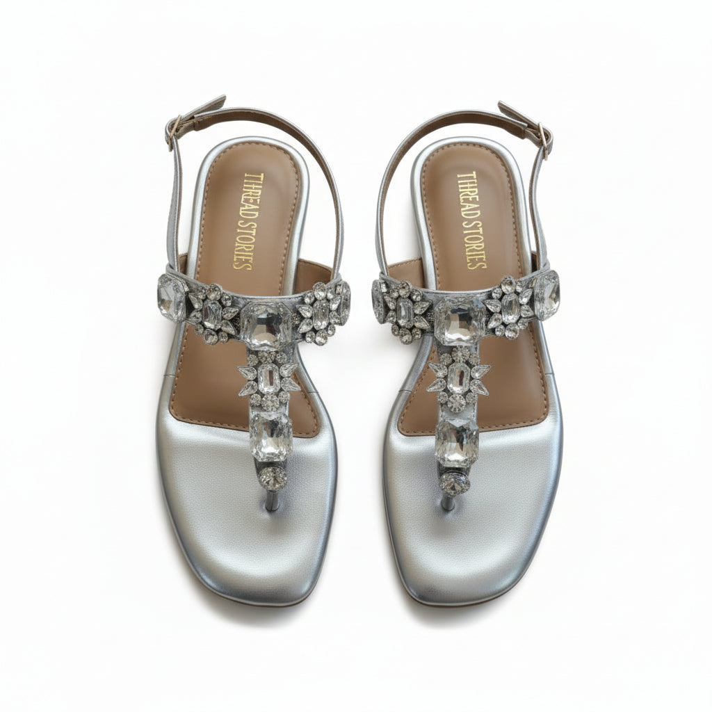 Elegant flats adorned with luminous stone embellishments, crafted to add effortless sparkle to your festive and evening looks. Designed with a comfortable sole and a sleek silhouette, these flats blend glamour with everyday ease.