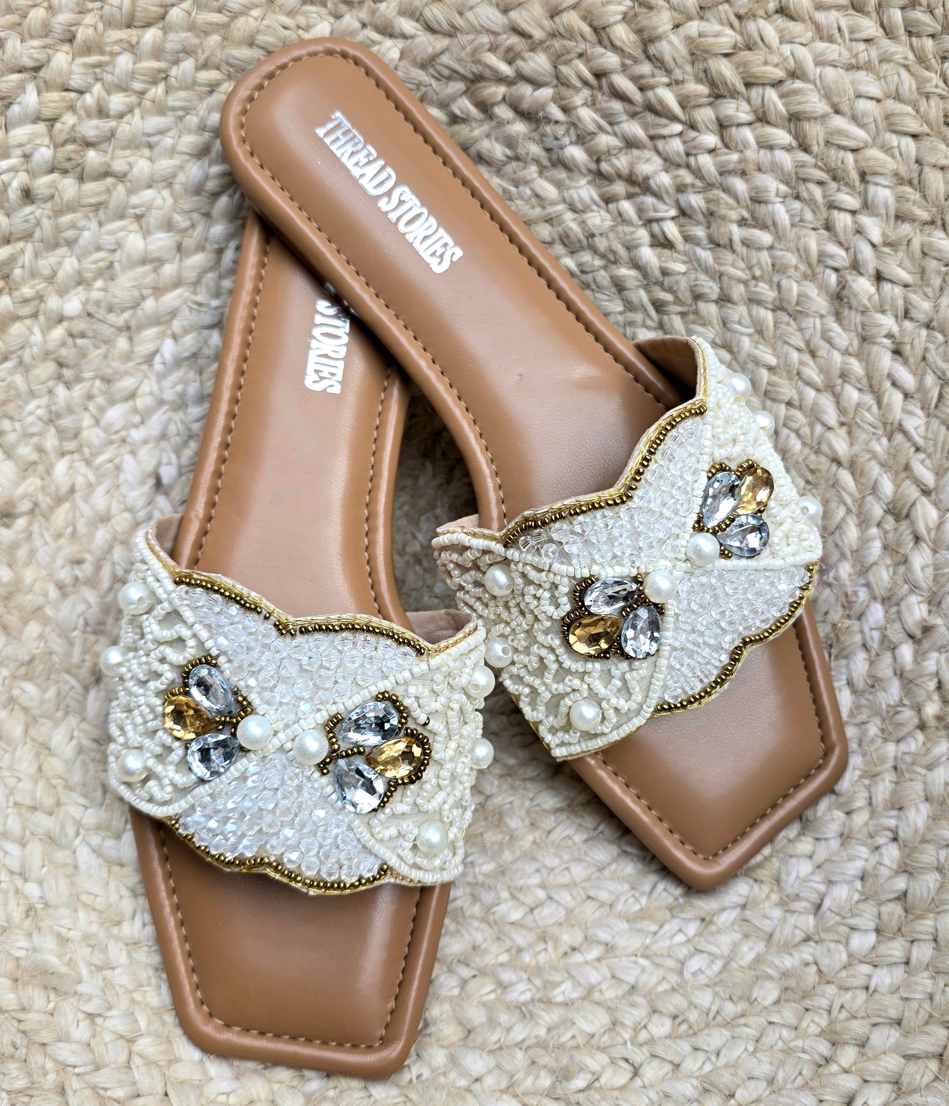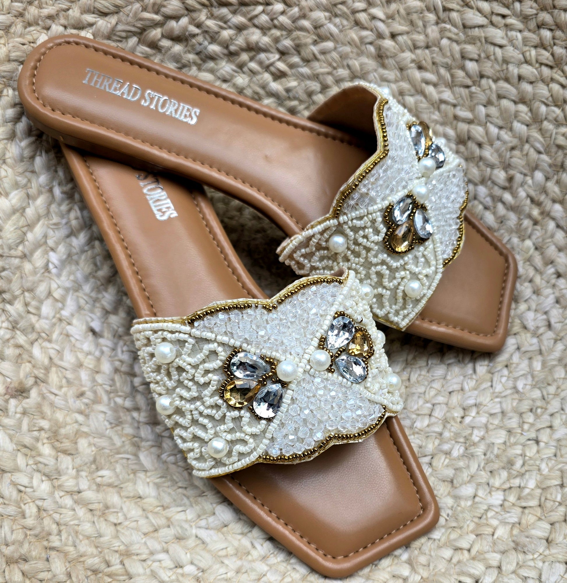 Delicate scalloped design embellished with pearls and crystals on a soft beige base. A refined pair to complement both ethnic and modern looks.