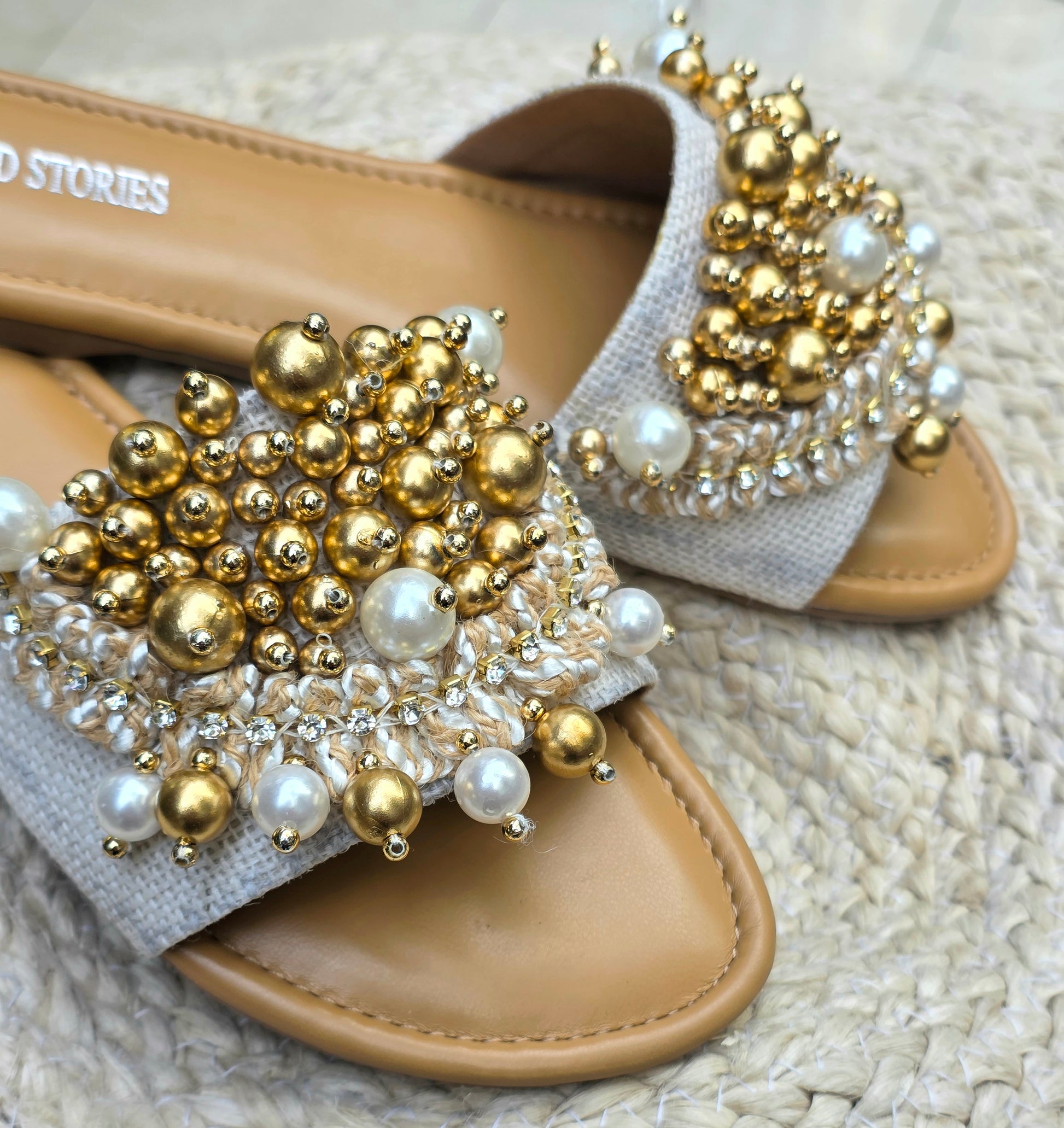 A refined take on our bestselling pearl design — this version features delicate mini pearls and golden bead clusters for a softer, more intricate look. Hand-embroidered on textured jute, it's a subtle statement with just the right hint of shimmer.