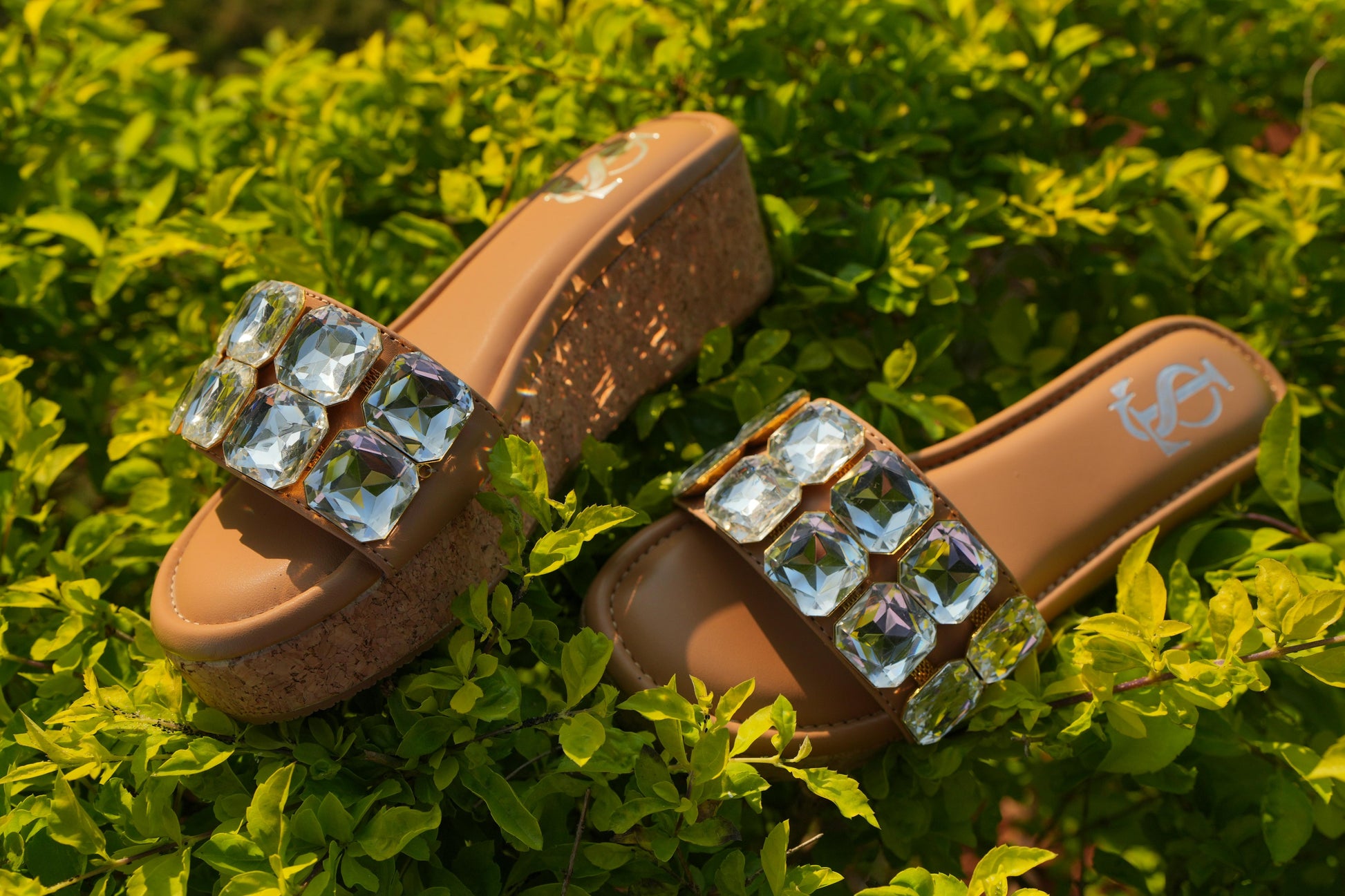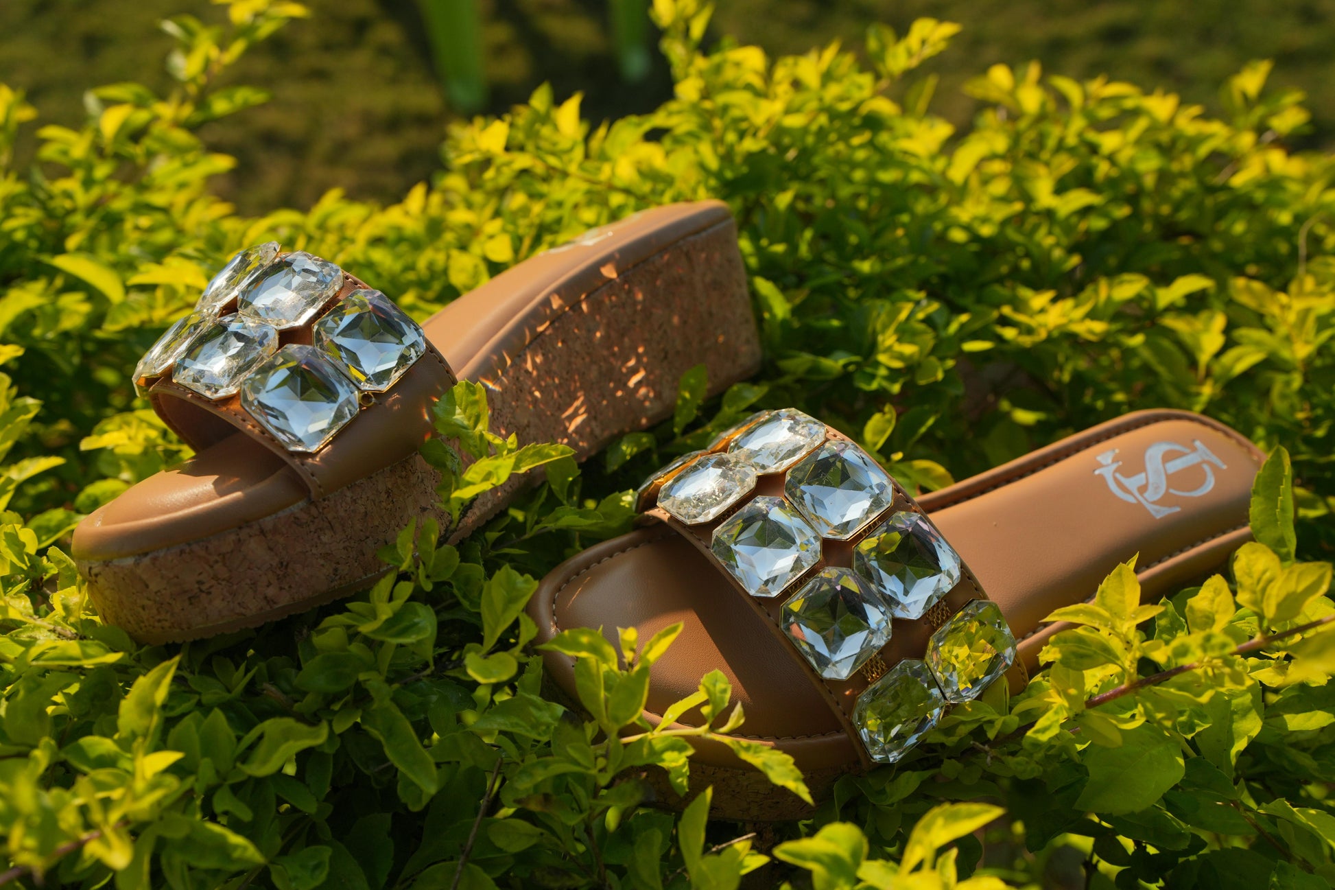 Turn heads with every step in these Crystal Luxe Wedges, designed with a comfortable 2.5-inch wedge heel and a wide strap adorned with clear oversized rhinestones. The neutral tan base makes them easy to pair with both festive and casual outfits, while the cushioned footbed ensures all-day wearability.