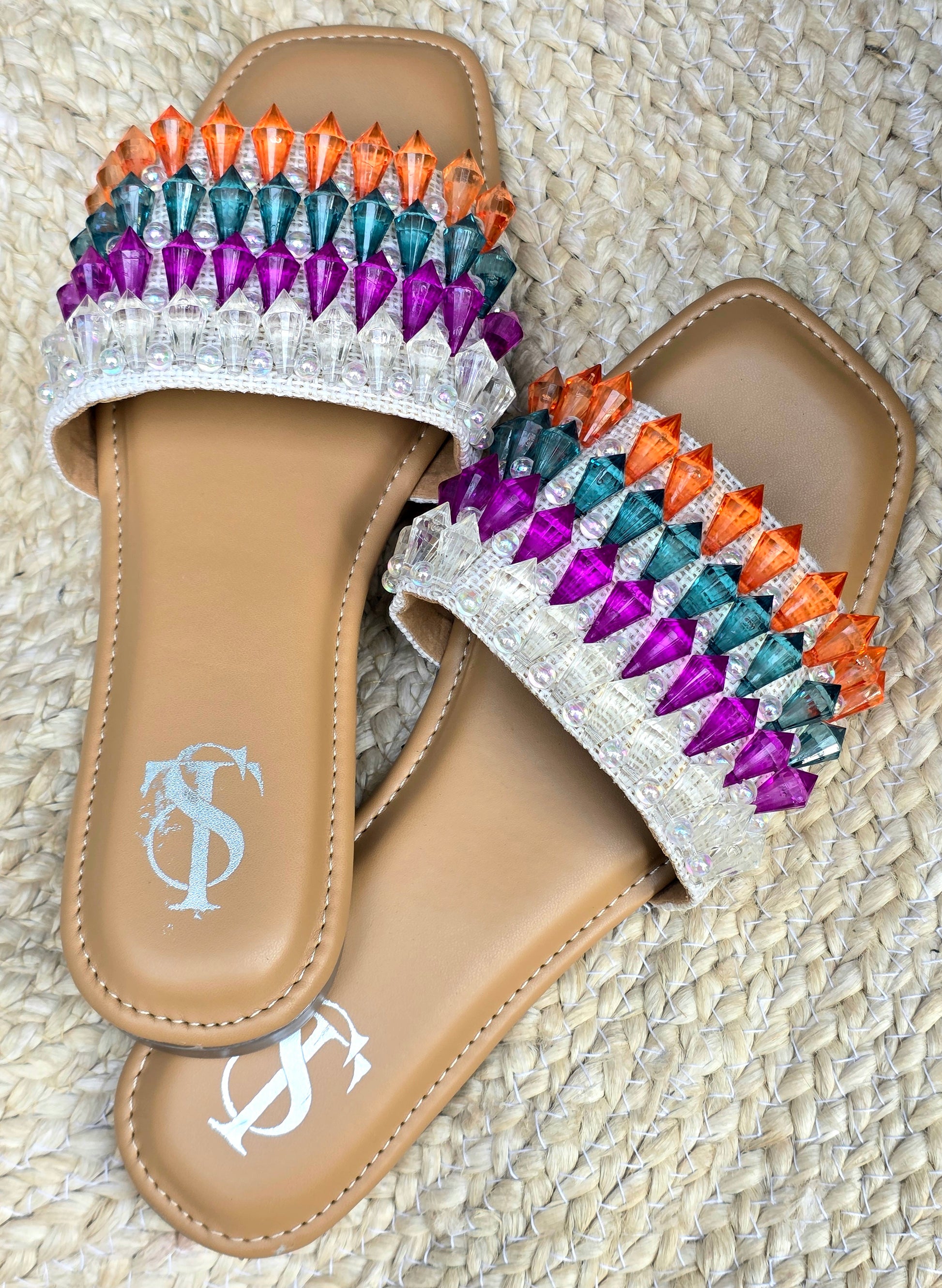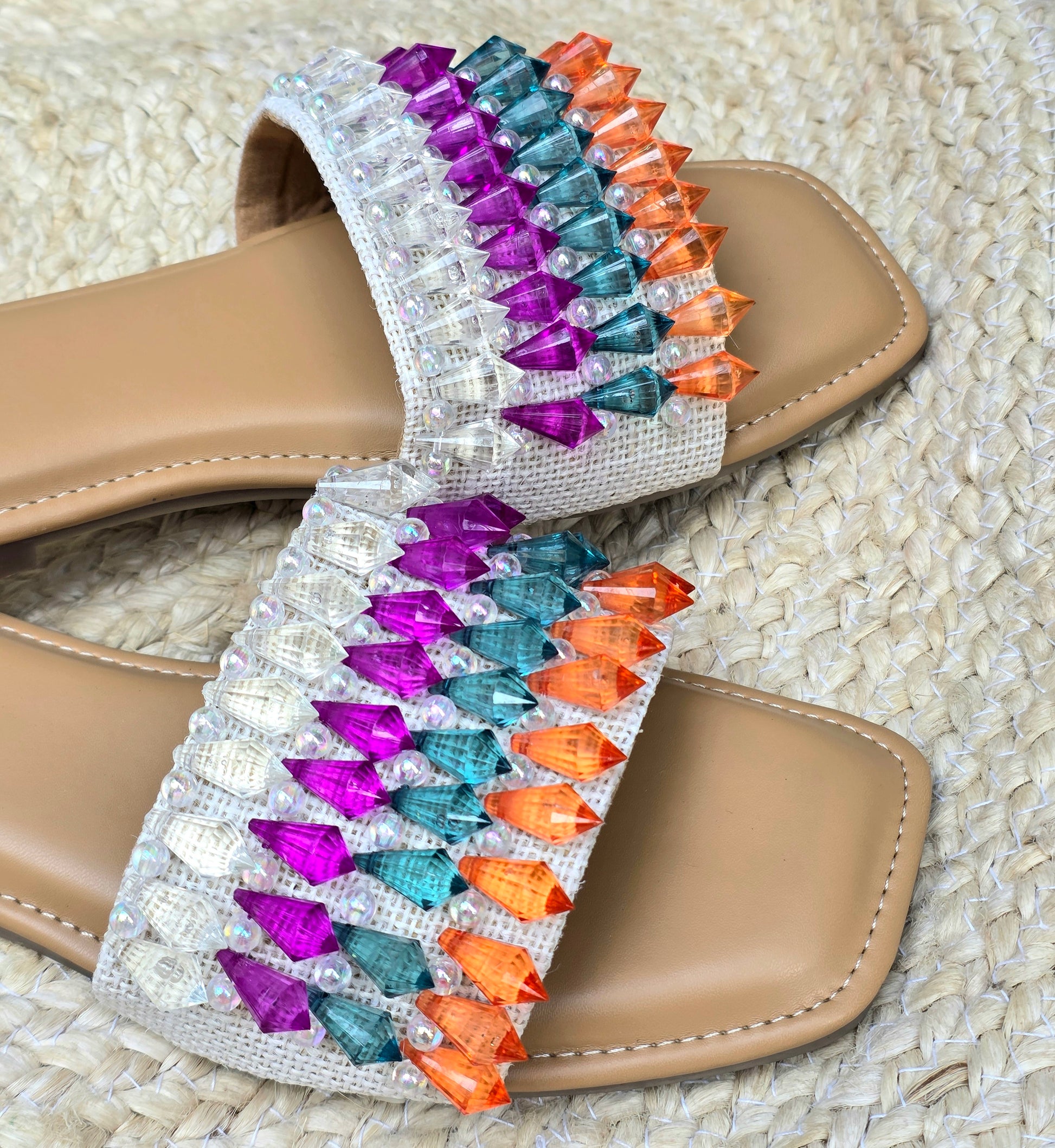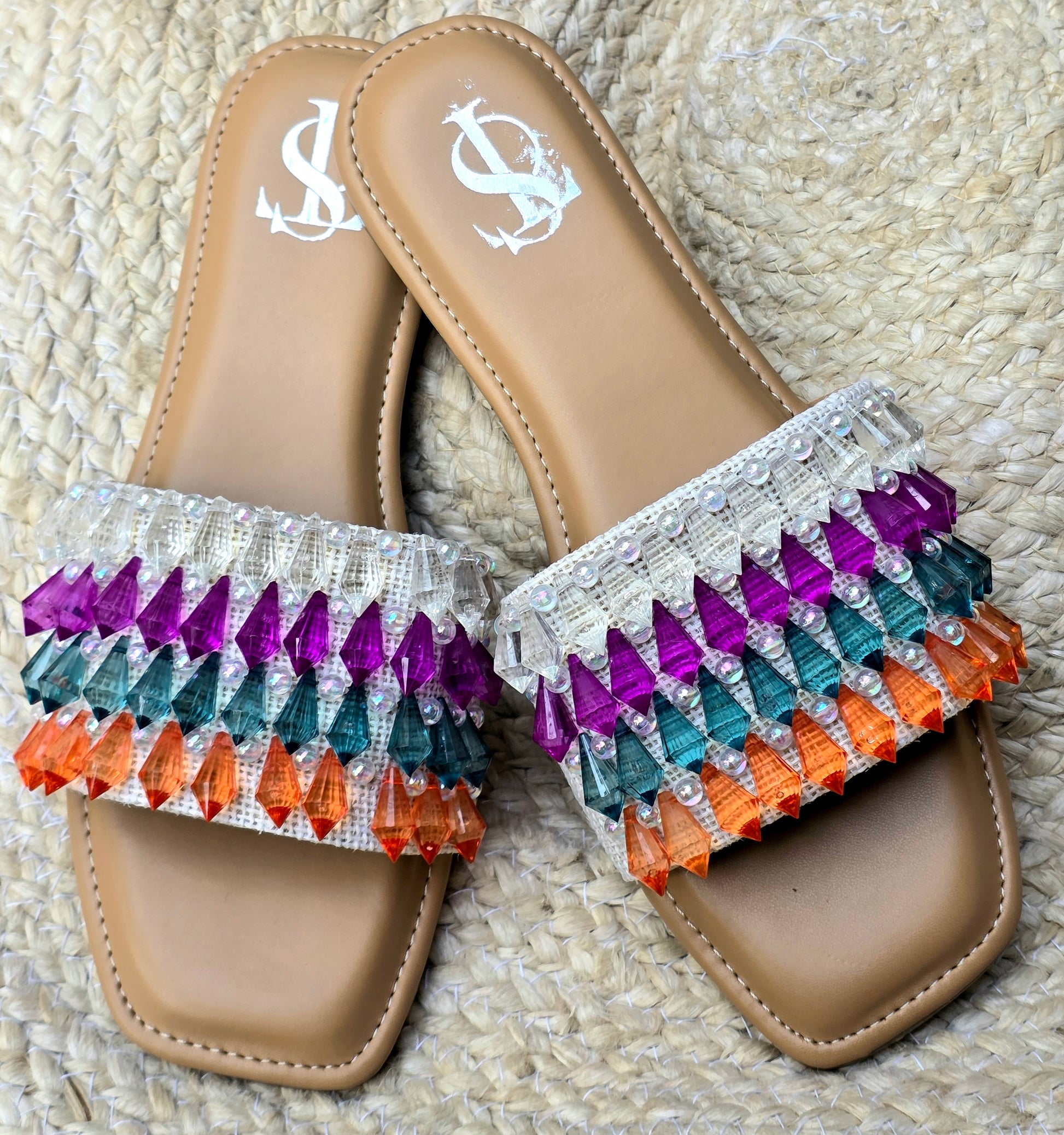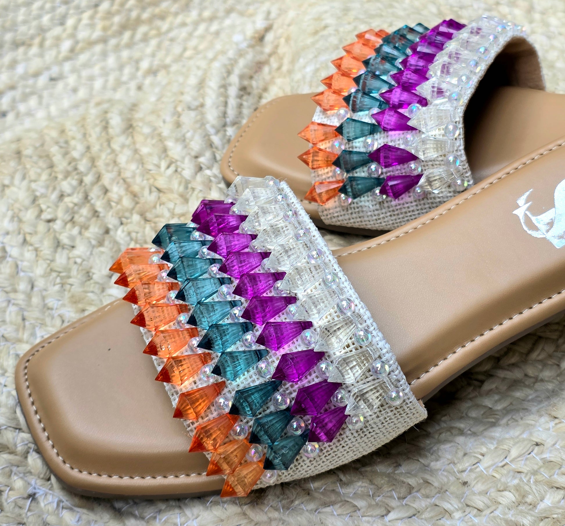Hand-embellished with vibrant crystal accents, these slides bring colour, sparkle, and comfort together. Easy to wear yet impossible to miss — your go-to flats for elevated everyday dressing.