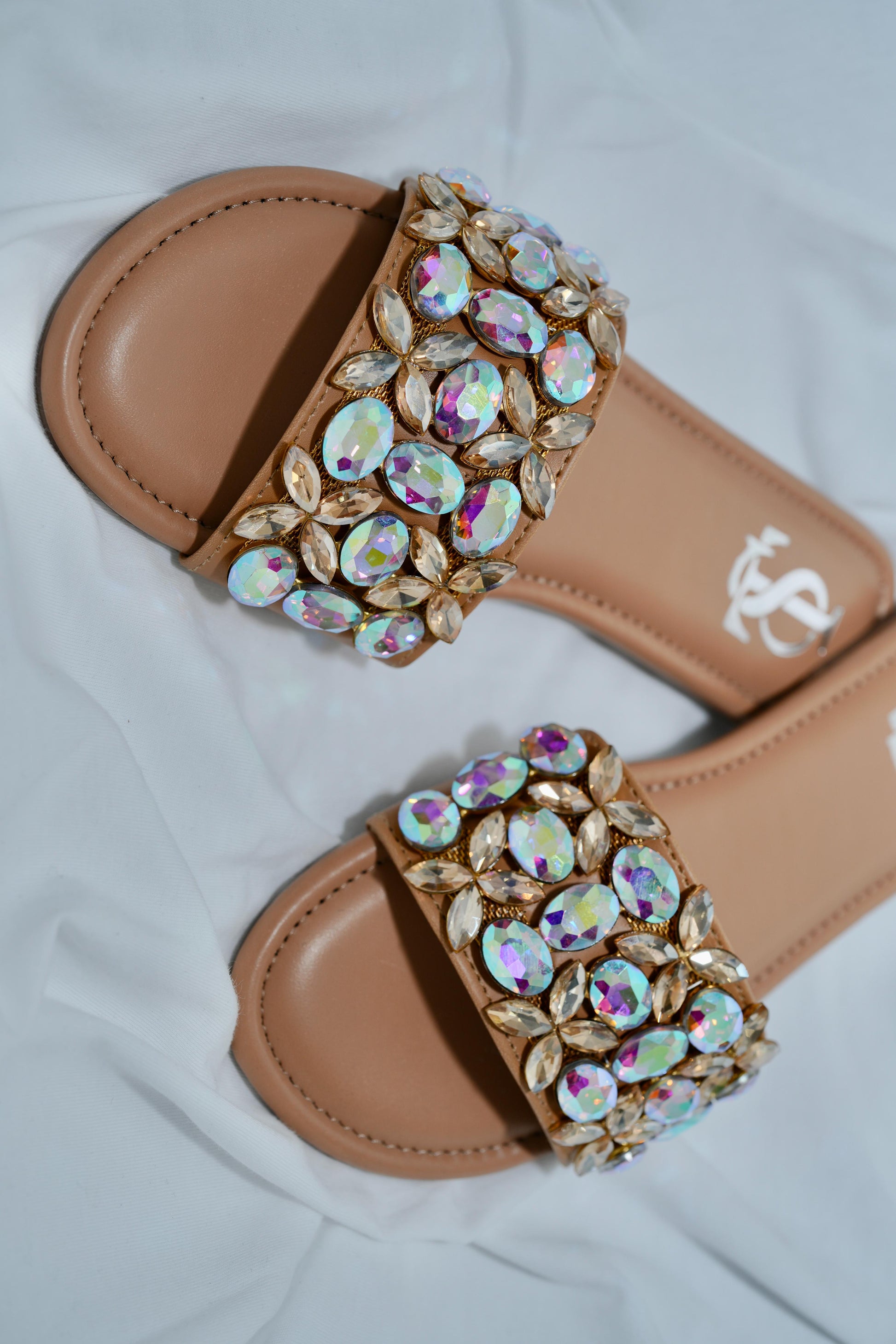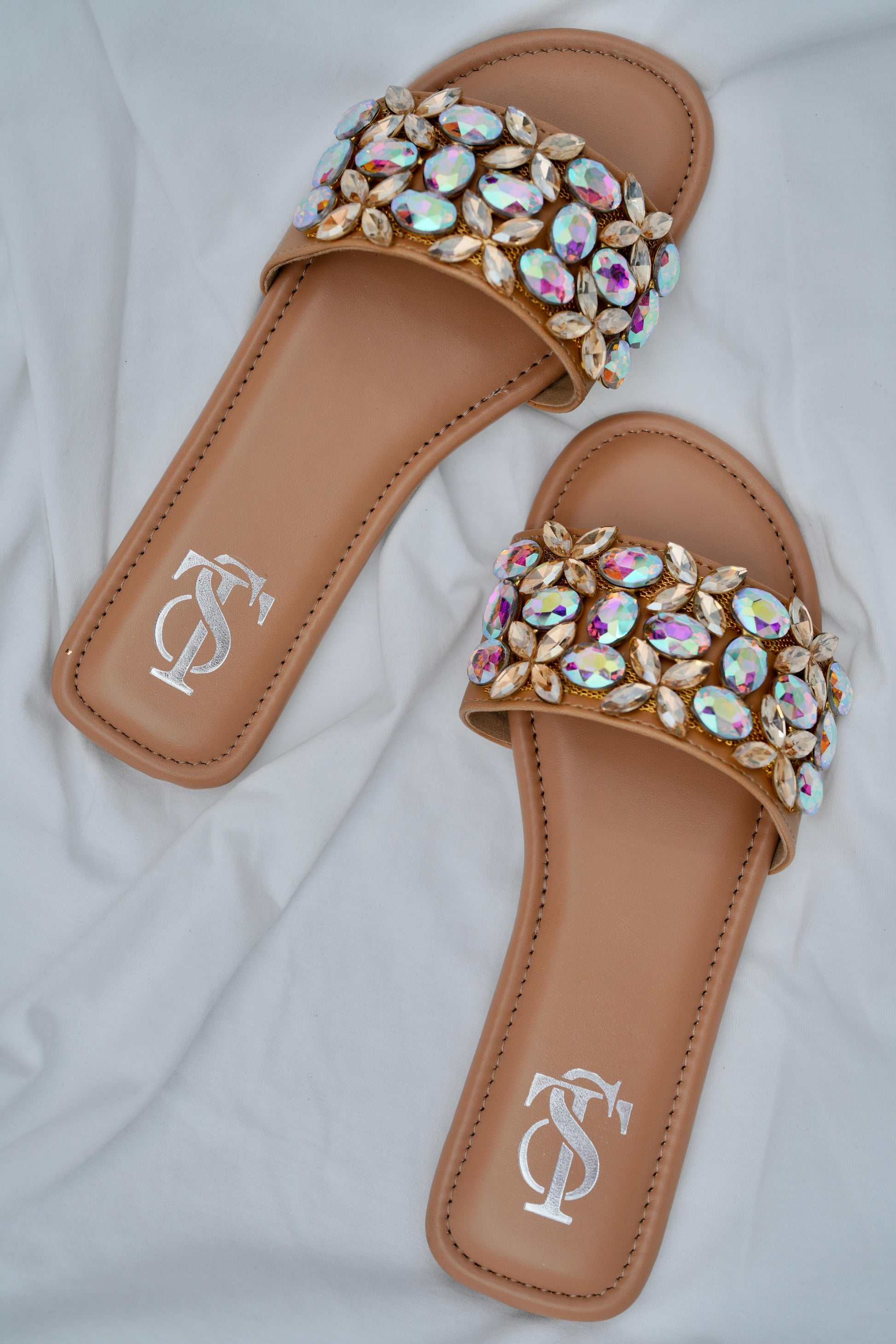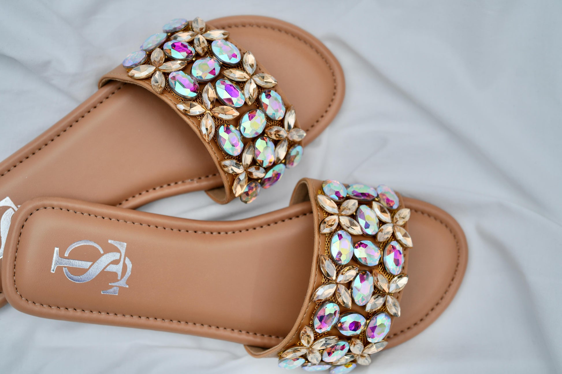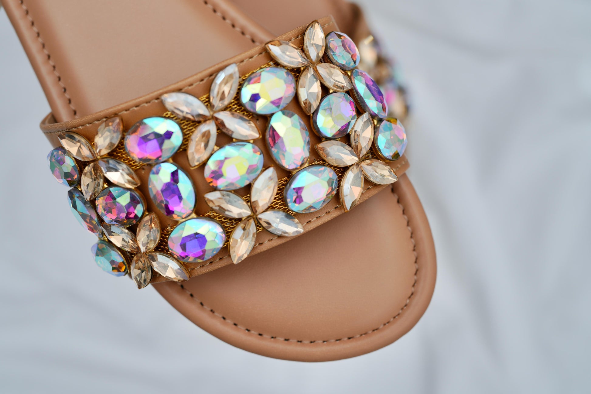 Featuring a nude base with a  wide strap adorned in radiant, multi-faceted crystals and floral gold embellishments, these sandals are perfect for festive occasions, resort evenings, or simply adding sparkle to your day. Crafted for comfort, styled for elegance.
